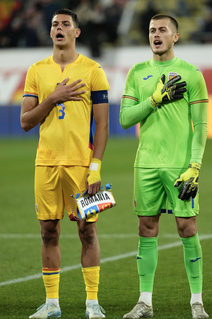Descriere: Fotbalistii romani Matteo Dutu si Stefan Lefter la intonarea imnului national inaintea meciului amical de fotbal dintre Romania U21 si Serbia U21, desfasurat pe Stadionul Francisc Neuman din Arad, vineri 10 octombrie 2025. © FOTO:Alexandra Fechete/SPORT PICTURES