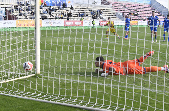 Descriere: Panagi Stavros priveste cum mingea intra in poarta in meciul amical de fotbal dintre Romania U19 si Cipru U19, desfasurat pe Stadionul Anghel Iordănescu din Voluntari, sambata 11 octombrie 2025. © FOTO:Simion Mechno/SPORT PICTURES