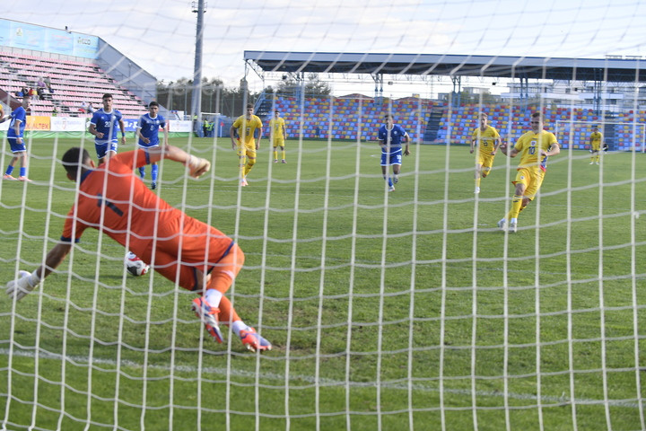 Descriere: Mihai Toma executa o lovitura de la 11m in meciul amical de fotbal dintre Romania U19 si Cipru U19, desfasurat pe Stadionul Anghel Iordănescu din Voluntari, sambata 11 octombrie 2025. © FOTO:Simion Mechno/SPORT PICTURES