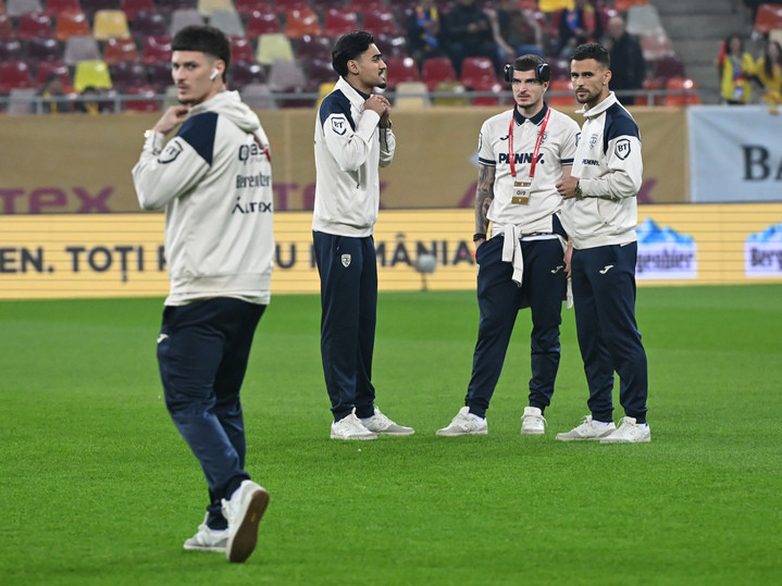 Descriere: Fotbalistii romani Stefan Baiaram, Valentin Mihaila si Marius Marin la inspectia terenului inaintea meciului de fotbal dintre Romania si Austria, din cadrul Preliminariilor Campionatului Mondial 2026, desfasurat pe Arena Nationala din Bucuresti, duminica 12 octombrie 2025. © FOTO:Razvan Pasarica/SPORT PICTURES