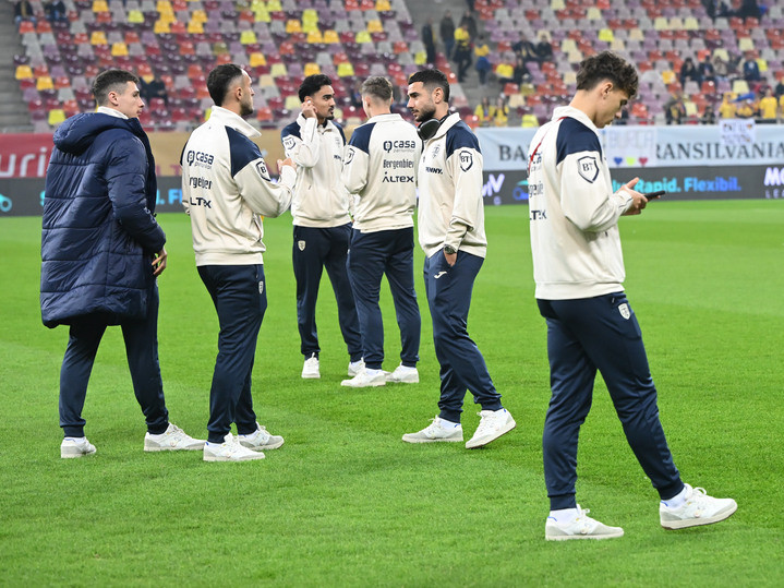 Descriere: Fotbalistii romani Bogdan Racovitan, Virgil Ghita, Stefan Baiaram si Vladimir Screciu la inspectia terenului inaintea meciului de fotbal dintre Romania si Austria, din cadrul Preliminariilor Campionatului Mondial 2026, desfasurat pe Arena Nationala din Bucuresti, duminica 12 octombrie 2025. © FOTO:Razvan Pasarica/SPORT PICTURES