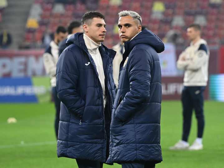 Descriere: Fotbalistii romani Bogdan Racovitan si Cristian Manea la inspectia terenului inaintea meciului de fotbal dintre Romania si Austria, din cadrul Preliminariilor Campionatului Mondial 2026, desfasurat pe Arena Nationala din Bucuresti, duminica 12 octombrie 2025. © FOTO:Razvan Pasarica/SPORT PICTURES