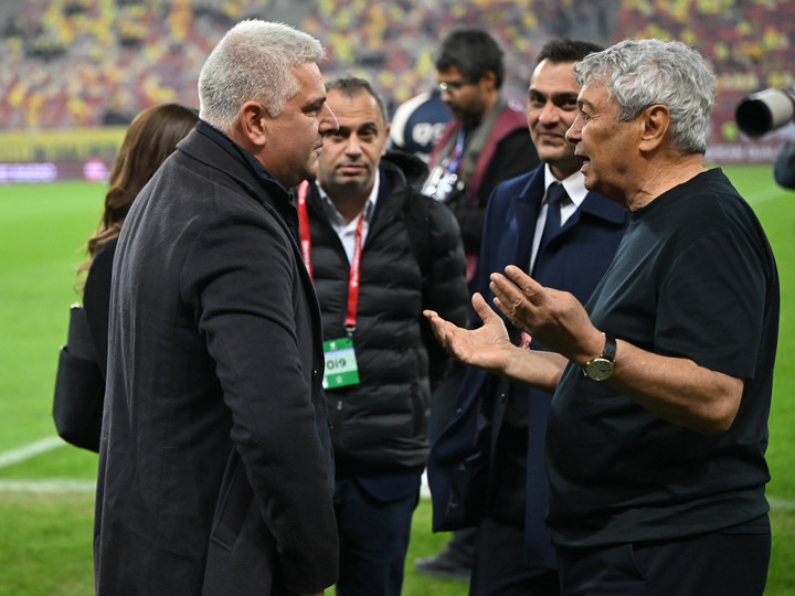 Descriere: Dan Filoti discuta cu Mircea Lucescu inaintea meciului de fotbal dintre Romania si Austria, din cadrul Preliminariilor Campionatului Mondial 2026, desfasurat pe Arena Nationala din Bucuresti, duminica 12 octombrie 2025. © FOTO:Razvan Pasarica/SPORT PICTURES