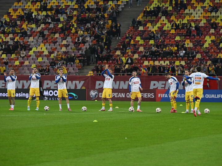 Descriere: Fotbalistii romani Marius Marin, Mihai Popescu, Ianis Hagi, Daniel Birligea, Valentin Mihaila, Alexandru Mihaita Chipciu si Vlad Dragomir la incalzire inaintea meciului de fotbal dintre Romania si Austria, din cadrul Preliminariilor Campionatului Mondial 2026, desfasurat pe Arena Nationala din Bucuresti, duminica 12 octombrie 2025. © FOTO:Razvan Pasarica/SPORT PICTURES