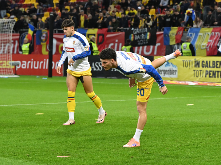 Descriere: Fotbalistii romani Andrei Rațiu si Dennis Man la incalzire inaintea meciului de fotbal dintre Romania si Austria, din cadrul Preliminariilor Campionatului Mondial 2026, desfasurat pe Arena Nationala din Bucuresti, duminica 12 octombrie 2025. © FOTO:Razvan Pasarica/SPORT PICTURES