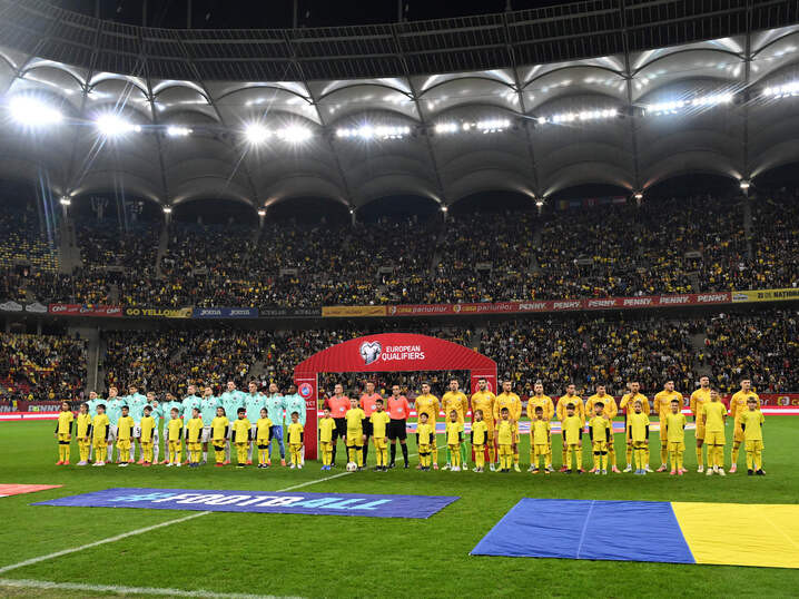 Descriere: Fotbalistii celor doua echipe alaturi de brigada de arbitrii la startul meciului de fotbal dintre Romania si Austria, din cadrul Preliminariilor Campionatului Mondial 2026, desfasurat pe Arena Nationala din Bucuresti, duminica 12 octombrie 2025. © FOTO:Razvan Pasarica/SPORT PICTURES