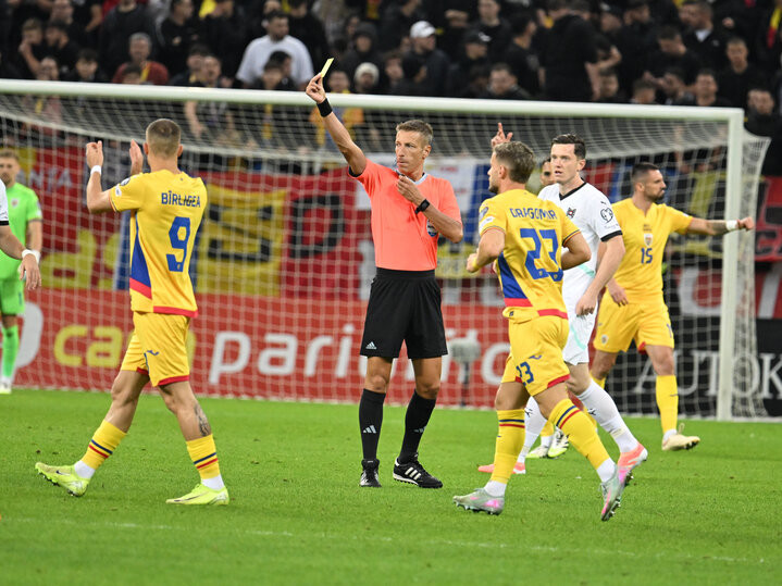 Descriere: Arbitrul central Davide Massa acorda un cartonas galben la meciul de fotbal dintre Romania si Austria, din cadrul Preliminariilor Campionatului Mondial 2026, desfasurat pe Arena Nationala din Bucuresti, duminica 12 octombrie 2025. © FOTO:Razvan Pasarica/SPORT PICTURES