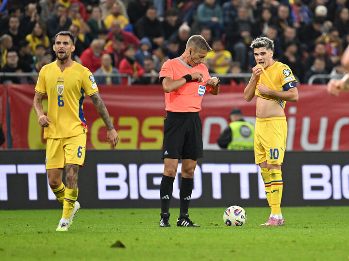 Descriere: Arbitrul central Davide Massa alaturi de Marius Marin si Ianis Hagi la meciul de fotbal dintre Romania si Austria, din cadrul Preliminariilor Campionatului Mondial 2026, desfasurat pe Arena Nationala din Bucuresti, duminica 12 octombrie 2025. © FOTO:Razvan Pasarica/SPORT PICTURES