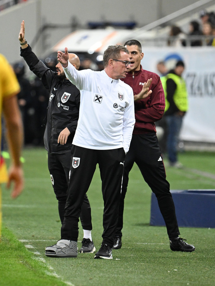 Descriere: Arbitrul de rezerva Simone Sozza reactioneaza alaturi de Ralf Rangnick la meciul de fotbal dintre Romania si Austria, din cadrul Preliminariilor Campionatului Mondial 2026, desfasurat pe Arena Nationala din Bucuresti, duminica 12 octombrie 2025. © FOTO:Razvan Pasarica/SPORT PICTURES