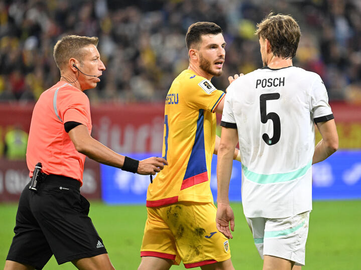 Descriere: Mihai Popescu discuta cu Stefan Posch sub privirile arbitrului central Davide Massa la meciul de fotbal dintre Romania si Austria, din cadrul Preliminariilor Campionatului Mondial 2026, desfasurat pe Arena Nationala din Bucuresti, duminica 12 octombrie 2025. © FOTO:Razvan Pasarica/SPORT PICTURES