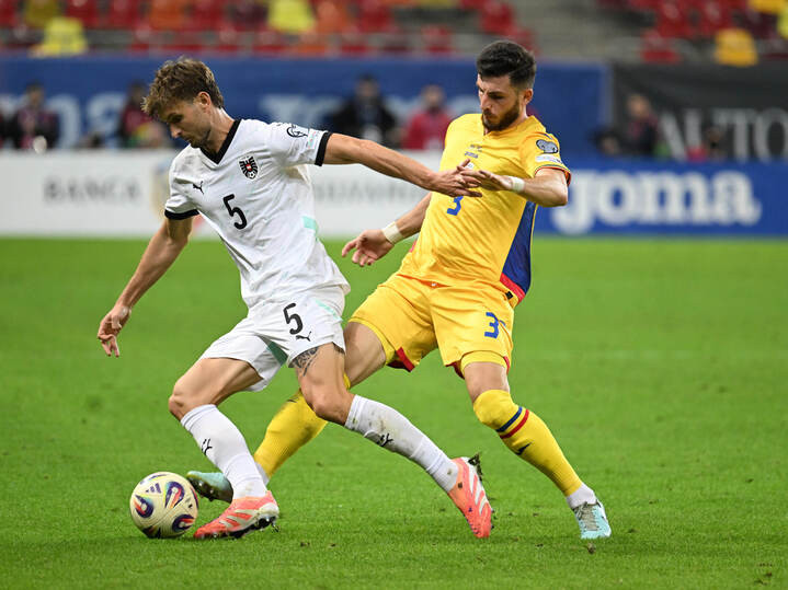 Descriere: Stefan Posch si Mihai Popescu la meciul de fotbal dintre Romania si Austria, din cadrul Preliminariilor Campionatului Mondial 2026, desfasurat pe Arena Nationala din Bucuresti, duminica 12 octombrie 2025. © FOTO:Razvan Pasarica/SPORT PICTURES