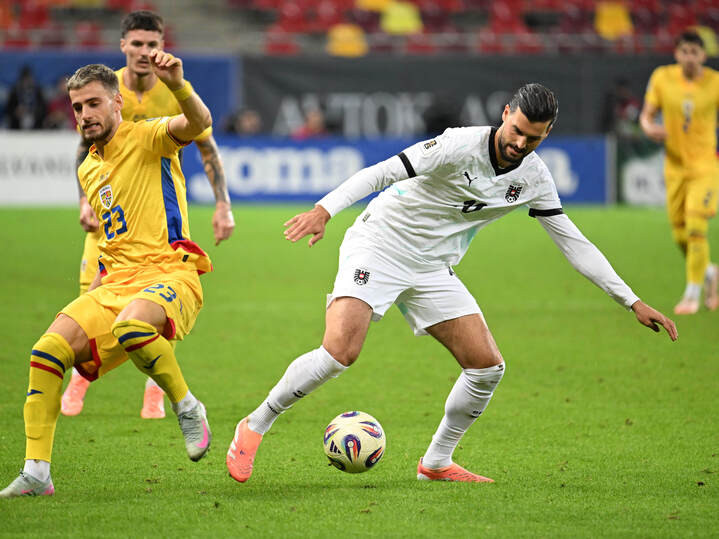 Descriere: Vlad Dragomir si Florian Grillitsch la meciul de fotbal dintre Romania si Austria, din cadrul Preliminariilor Campionatului Mondial 2026, desfasurat pe Arena Nationala din Bucuresti, duminica 12 octombrie 2025. © FOTO:Razvan Pasarica/SPORT PICTURES
