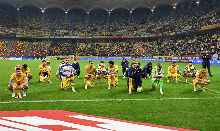 Descriere: Fotbalistii romani Valentin Mihaila, Vlad Dragomir, Daniel Birligea, Virgil Ghita, Kevin Ciubotaru, Ştefan Târnovanu, Dennis Man, Ianis Hagi, Ionut Radu, Louis Munteanu, Stefan Baiaram si Andrei Burca saluta galeria dupa meciul de fotbal dintre Romania si Austria, din cadrul Preliminariilor Campionatului Mondial 2026, desfasurat pe Arena Nationala din Bucuresti, duminica 12 octombrie 2025. © FOTO:Razvan Pasarica/SPORT PICTURES