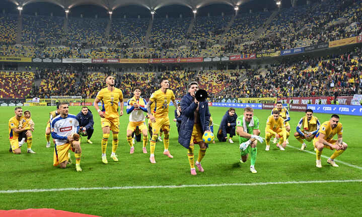 Descriere: Fotbalistii romani Valentin Mihaila, Vlad Dragomir, Daniel Birligea, Virgil Ghita, Kevin Ciubotaru, Ştefan Târnovanu, Dennis Man, Ianis Hagi, Ionut Radu, Louis Munteanu, Stefan Baiaram si Andrei Burca saluta galeria dupa meciul de fotbal dintre Romania si Austria, din cadrul Preliminariilor Campionatului Mondial 2026, desfasurat pe Arena Nationala din Bucuresti, duminica 12 octombrie 2025. © FOTO:Razvan Pasarica/SPORT PICTURES
