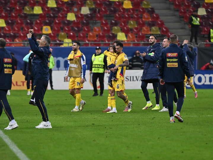 Descriere: Fotbalistii romani Vladimir Screciu, Marius Marin si Razvan Sava se bucura dupa meciul de fotbal dintre Romania si Austria, din cadrul Preliminariilor Campionatului Mondial 2026, desfasurat pe Arena Nationala din Bucuresti, duminica 12 octombrie 2025. © FOTO:Razvan Pasarica/SPORT PICTURES