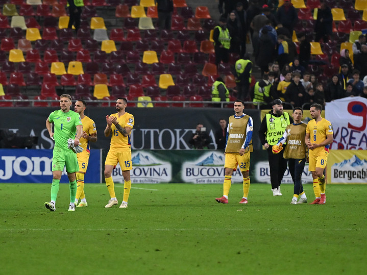 Descriere: Fotbalistii romani Ionut Radu, Virgil Ghita, Andrei Burca, Adrian Sut, Olimpiu Morutan si Alexandru Mihaita Chipciu saluta suporterii dupa meciul de fotbal dintre Romania si Austria, din cadrul Preliminariilor Campionatului Mondial 2026, desfasurat pe Arena Nationala din Bucuresti, duminica 12 octombrie 2025. © FOTO:Razvan Pasarica/SPORT PICTURES