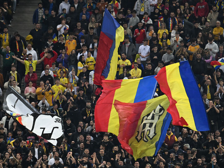 Descriere: Steaguri tricolore fluturate in peluza la meciul de fotbal dintre Romania si Austria, din cadrul Preliminariilor Campionatului Mondial 2026, desfasurat pe Arena Nationala din Bucuresti, duminica 12 octombrie 2025. © FOTO:Razvan Pasarica/SPORT PICTURES