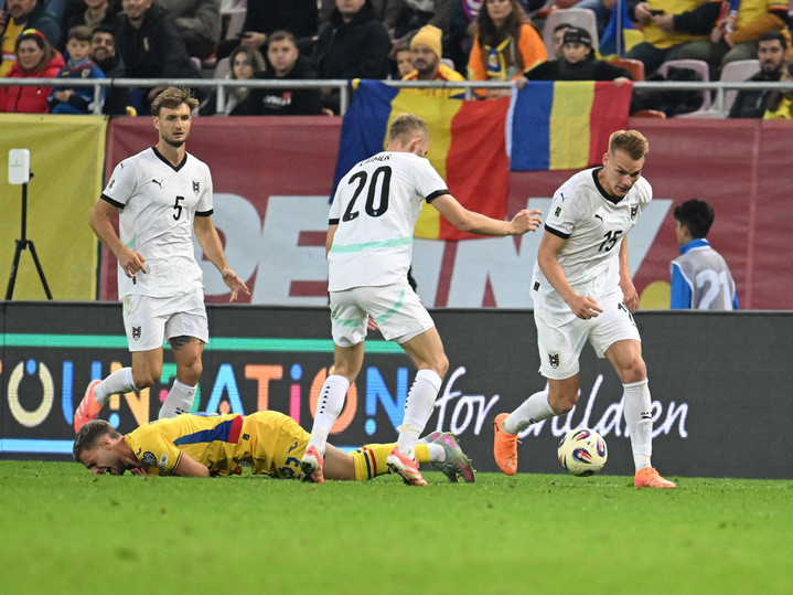 Descriere: Stefan Posch, Konrad Laimer, Philipp Lienhart si Vlad Dragomir la pamant la meciul de fotbal dintre Romania si Austria, din cadrul Preliminariilor Campionatului Mondial 2026, desfasurat pe Arena Nationala din Bucuresti, duminica 12 octombrie 2025. © FOTO:Razvan Pasarica/SPORT PICTURES
