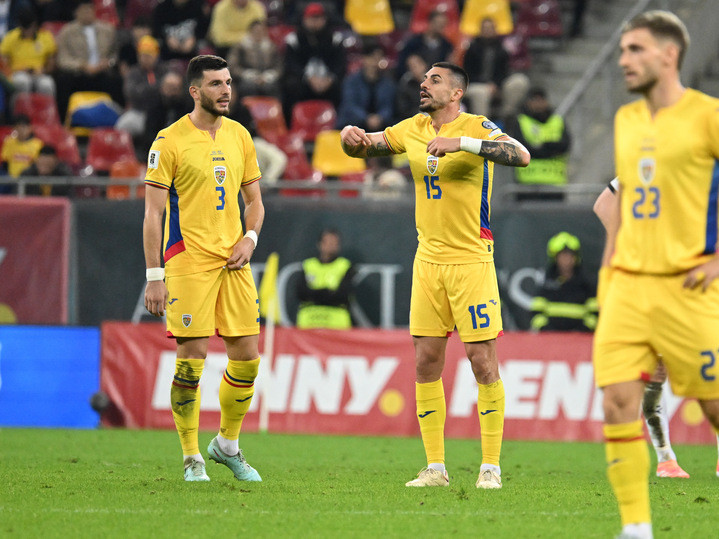 Descriere: Fotbalistii romani Mihai Popescu si Andrei Burca reactioneaza la meciul de fotbal dintre Romania si Austria, din cadrul Preliminariilor Campionatului Mondial 2026, desfasurat pe Arena Nationala din Bucuresti, duminica 12 octombrie 2025. © FOTO:Razvan Pasarica/SPORT PICTURES