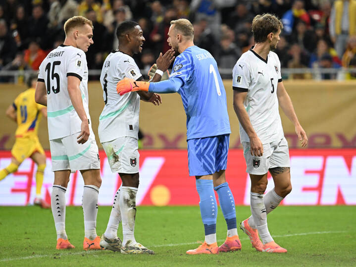 Descriere: Alexander Schlager felicitat de fotbalistii austrieci Philipp Lienhart, David Alaba si Stefan Posch la meciul de fotbal dintre Romania si Austria, din cadrul Preliminariilor Campionatului Mondial 2026, desfasurat pe Arena Nationala din Bucuresti, duminica 12 octombrie 2025. © FOTO:Razvan Pasarica/SPORT PICTURES