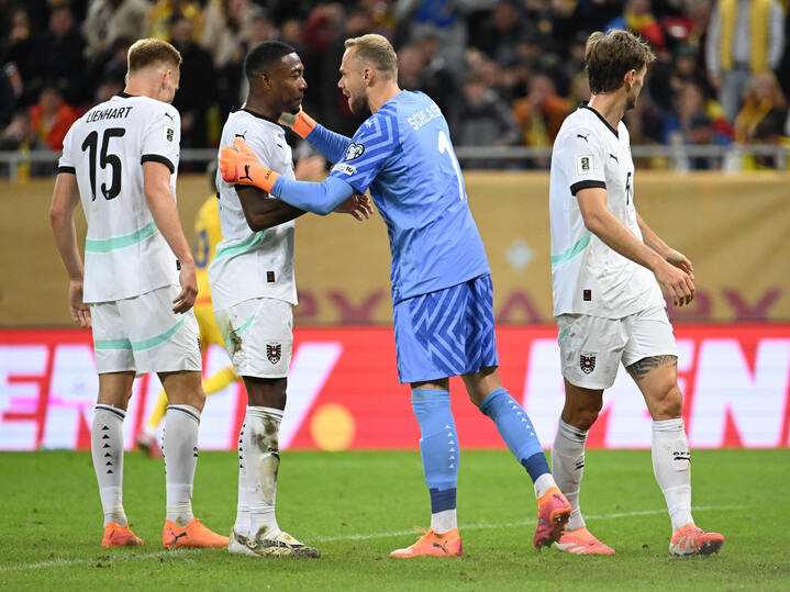Descriere: Alexander Schlager felicitat de fotbalistii austrieci Philipp Lienhart, David Alaba si Stefan Posch la meciul de fotbal dintre Romania si Austria, din cadrul Preliminariilor Campionatului Mondial 2026, desfasurat pe Arena Nationala din Bucuresti, duminica 12 octombrie 2025. © FOTO:Razvan Pasarica/SPORT PICTURES