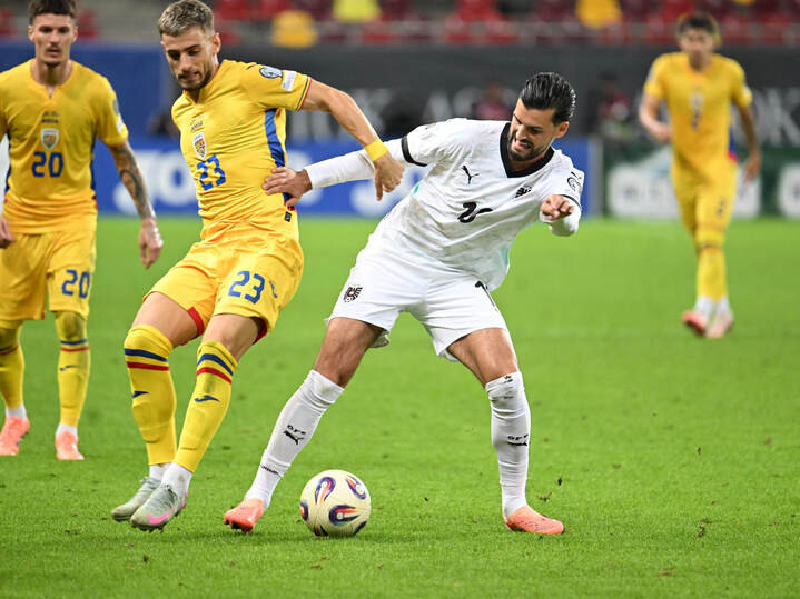 Descriere: Vlad Dragomir si Florian Grillitsch la meciul de fotbal dintre Romania si Austria, din cadrul Preliminariilor Campionatului Mondial 2026, desfasurat pe Arena Nationala din Bucuresti, duminica 12 octombrie 2025. © FOTO:Razvan Pasarica/SPORT PICTURES