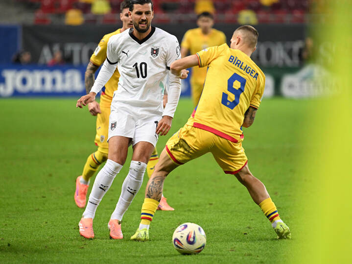 Descriere: Florian Grillitsch si Daniel Birligea la meciul de fotbal dintre Romania si Austria, din cadrul Preliminariilor Campionatului Mondial 2026, desfasurat pe Arena Nationala din Bucuresti, duminica 12 octombrie 2025. © FOTO:Razvan Pasarica/SPORT PICTURES