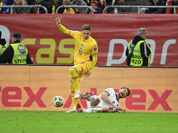 Descriere: Louis Munteanu si Stefan Posch la meciul de fotbal dintre Romania si Austria, din cadrul Preliminariilor Campionatului Mondial 2026, desfasurat pe Arena Nationala din Bucuresti, duminica 12 octombrie 2025. © FOTO:Razvan Pasarica/SPORT PICTURES