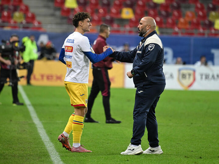 Descriere: Kevin Ciubotaru felicitat dupa meciul de fotbal dintre Romania si Austria, din cadrul Preliminariilor Campionatului Mondial 2026, desfasurat pe Arena Nationala din Bucuresti, duminica 12 octombrie 2025. © FOTO:Razvan Pasarica/SPORT PICTURES