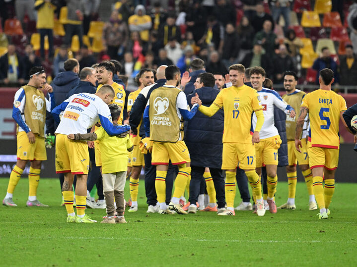 Descriere: Fotbalistii romani printre care Andrei Rațiu se bucura dupa meciul de fotbal dintre Romania si Austria, din cadrul Preliminariilor Campionatului Mondial 2026, desfasurat pe Arena Nationala din Bucuresti, duminica 12 octombrie 2025. © FOTO:Razvan Pasarica/SPORT PICTURES