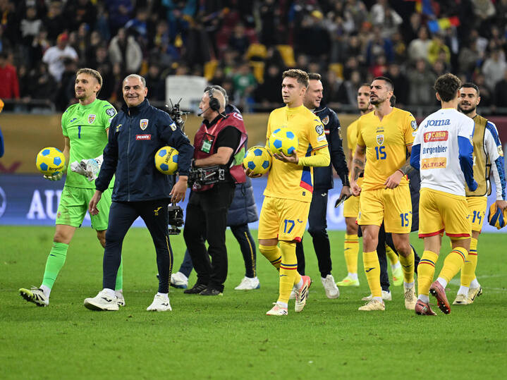 Descriere: Fotbalistii romani printre care Ionut Radu, Louis Munteanu, Andrei Burca si Vladimir Screciu, alaturi de Ionel Tersinio Gane, se bucura dupa meciul de fotbal dintre Romania si Austria, din cadrul Preliminariilor Campionatului Mondial 2026, desfasurat pe Arena Nationala din Bucuresti, duminica 12 octombrie 2025. © FOTO:Razvan Pasarica/SPORT PICTURES