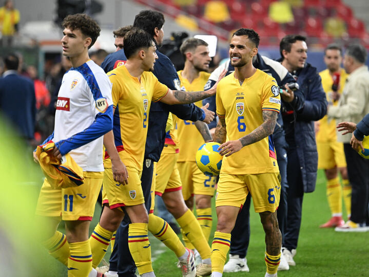Descriere: Fotbalistii romani Andrei Rațiu si Marius Marin se felicita dupa meciul de fotbal dintre Romania si Austria, din cadrul Preliminariilor Campionatului Mondial 2026, desfasurat pe Arena Nationala din Bucuresti, duminica 12 octombrie 2025. © FOTO:Razvan Pasarica/SPORT PICTURES