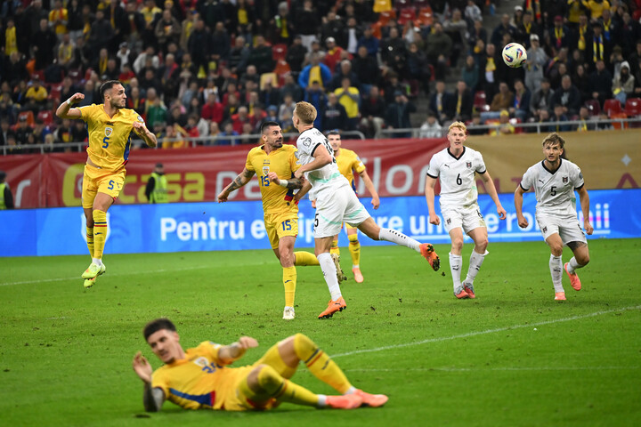 Descriere: Virgil Ghita marcheaza un gol de langa Andrei Burca, Philipp Lienhart, Nicolas Seiwald si Stefan Posch la meciul de fotbal dintre Romania si Austria, din cadrul Preliminariilor Campionatului Mondial 2026, desfasurat pe Arena Nationala din Bucuresti, duminica 12 octombrie 2025. © FOTO:Razvan Pasarica/SPORT PICTURES