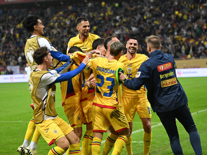 Descriere: Bucurie a fotbalistilor romani Stefan Baiaram, Kevin Ciubotaru, Marius Marin si Andrei Burca dupa un gol marcat la meciul de fotbal dintre Romania si Austria, din cadrul Preliminariilor Campionatului Mondial 2026, desfasurat pe Arena Nationala din Bucuresti, duminica 12 octombrie 2025. © FOTO:Razvan Pasarica/SPORT PICTURES