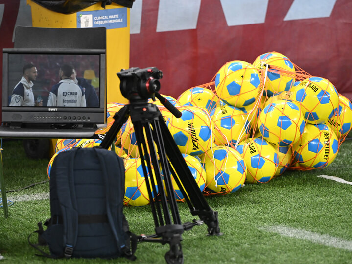 Descriere: Mingi pregatite pentru suporteri alaturi de un monitor cu chipul lui Virgil Ghita inaintea meciului de fotbal dintre Romania si Austria, din cadrul Preliminariilor Campionatului Mondial 2026, desfasurat pe Arena Nationala din Bucuresti, duminica 12 octombrie 2025. © FOTO:Razvan Pasarica/SPORT PICTURES