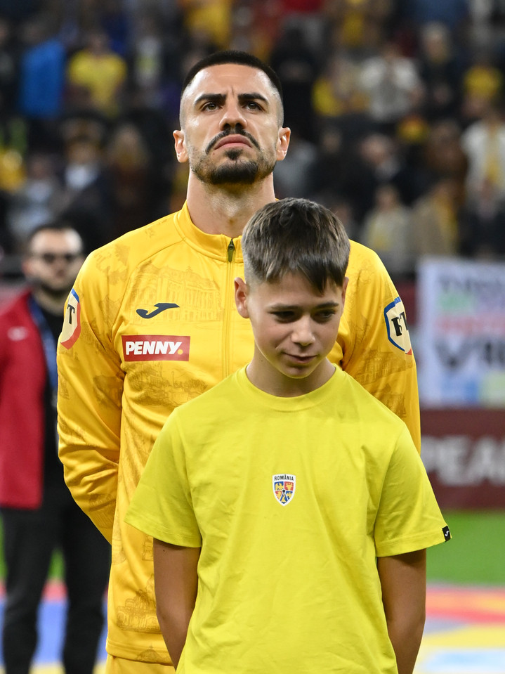 Descriere: Andrei Burca la intonarea imnului de stat inaintea meciului de fotbal dintre Romania si Austria, din cadrul Preliminariilor Campionatului Mondial 2026, desfasurat pe Arena Nationala din Bucuresti, duminica 12 octombrie 2025. © FOTO:Razvan Pasarica/SPORT PICTURES