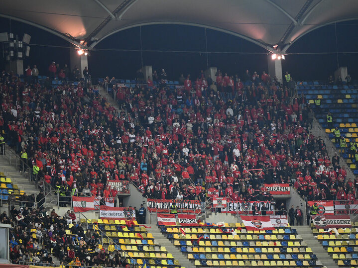 Descriere: Suporterii austrieci prezenti in peluza la meciul de fotbal dintre Romania si Austria, din cadrul Preliminariilor Campionatului Mondial 2026, desfasurat pe Arena Nationala din Bucuresti, duminica 12 octombrie 2025. © FOTO:Razvan Pasarica/SPORT PICTURES