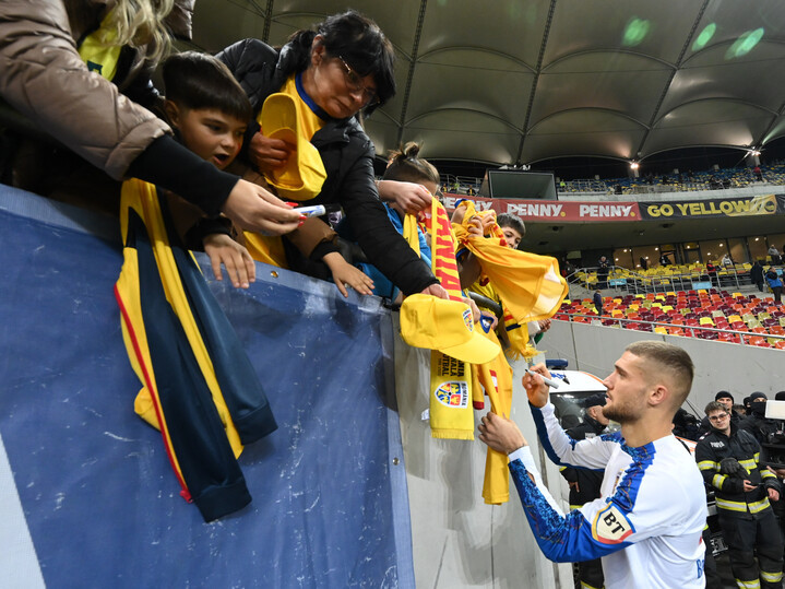 Descriere: Daniel Birligea da autografe suporterillor din peluza dupa meciul de fotbal dintre Romania si Austria, din cadrul Preliminariilor Campionatului Mondial 2026, desfasurat pe Arena Nationala din Bucuresti, duminica 12 octombrie 2025. © FOTO:Razvan Pasarica/SPORT PICTURES