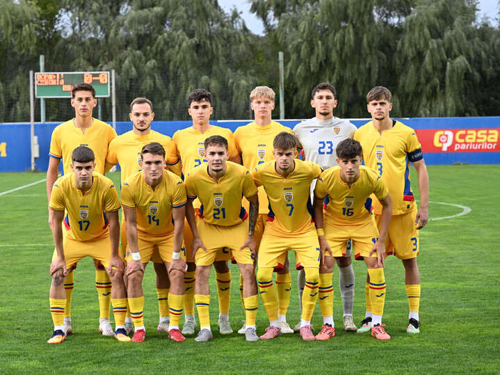 Descriere: Fotbalistii romani la o fotografie de grup realizata inaintea meciului de fotbal dintre Romania U20 si Cehia U20, contand pentru Elite League U20, desfasurat pe Stadionul central din cadrul Centrului National de Fotbal Buftea, luni 13 octombrie 2025. © FOTO:Razvan Pasarica/SPORT PICTURES