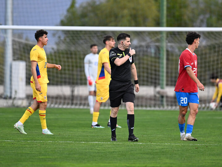 Descriere: Arbitrul central Bogdan Dumitrache reactioneaza in meciul de fotbal dintre Romania U20 si Cehia U20, contand pentru Elite League U20, desfasurat pe Stadionul central din cadrul Centrului National de Fotbal Buftea, luni 13 octombrie 2025. © FOTO:Razvan Pasarica/SPORT PICTURES