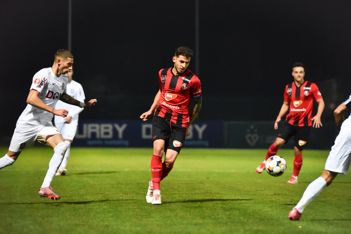 Descriere: Szilárd Veres si Andres Emil Sfait in meciul de fotbal dintre FK Csikszereda Miercurea Ciuc si FC CFR 1907 Cluj, contand pentru Superliga Superbet, desfasurat pe Stadionul Municipal din Miercurea Ciuc, joi 16 octombrie 2025. © FOTO:Zoltan Pal/SPORT PICTURES