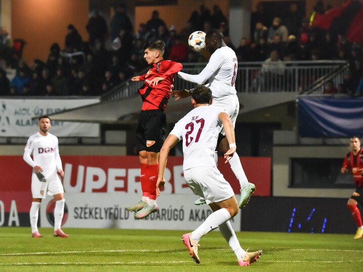 Descriere: Efraim Zoltán Bödő si Sheriff Sinyan, Matei Christian Ilie in meciul de fotbal dintre FK Csikszereda Miercurea Ciuc si FC CFR 1907 Cluj, contand pentru Superliga Superbet, desfasurat pe Stadionul Municipal din Miercurea Ciuc, joi 16 octombrie 2025. © FOTO:Zoltan Pal/SPORT PICTURES