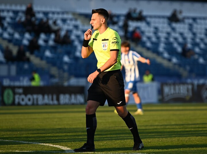 Descriere: Arbitrul central Raul Sebastian Badarau in meciul de fotbal dintre ACSM Politehnica Iasi si CS Dinamo Bucuresti, contand pentru Liga 2 Casa Pariurilor, desfasurat pe Stadionul Emil Alexandrescu din Iasi, vineri 17 octombrie 2025. © FOTO: Tudy/SPORT PICTURES