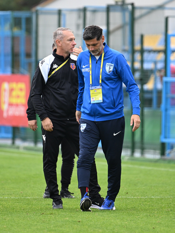 Descriere: Cei doi antrenori Eusebiu Tudor și Florin Pirvu se salută dupa meciul de fotbal dintre FC Voluntari si ASA Targu Mures, contand pentru Liga a-2-a Casa Pariurilor, desfasurat pe Stadionul Anghel Iordanescu din Voluntari, sambata 18 octombrie 2025. © FOTO:Razvan Pasarica/SPORT PICTURES