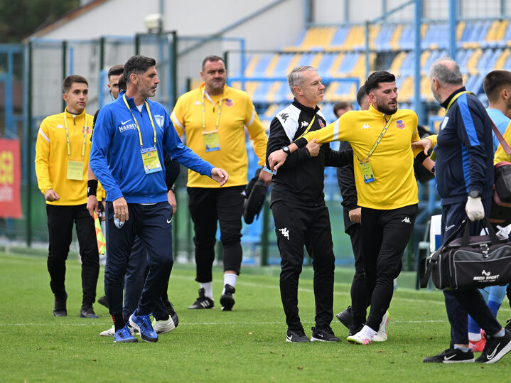 Descriere: Cei doi antrenori Eusebiu Tudor și Florin Pirvu se salută dupa meciul de fotbal dintre FC Voluntari si ASA Targu Mures, contand pentru Liga a-2-a Casa Pariurilor, desfasurat pe Stadionul Anghel Iordanescu din Voluntari, sambata 18 octombrie 2025. © FOTO:Razvan Pasarica/SPORT PICTURES