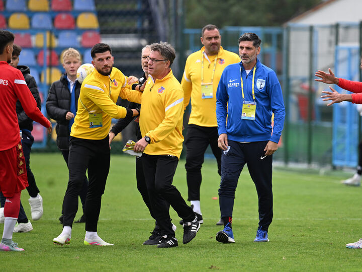 Descriere: Cei doi antrenori Eusebiu Tudor și Florin Pirvu se salută dupa meciul de fotbal dintre FC Voluntari si ASA Targu Mures, contand pentru Liga a-2-a Casa Pariurilor, desfasurat pe Stadionul Anghel Iordanescu din Voluntari, sambata 18 octombrie 2025. © FOTO:Razvan Pasarica/SPORT PICTURES