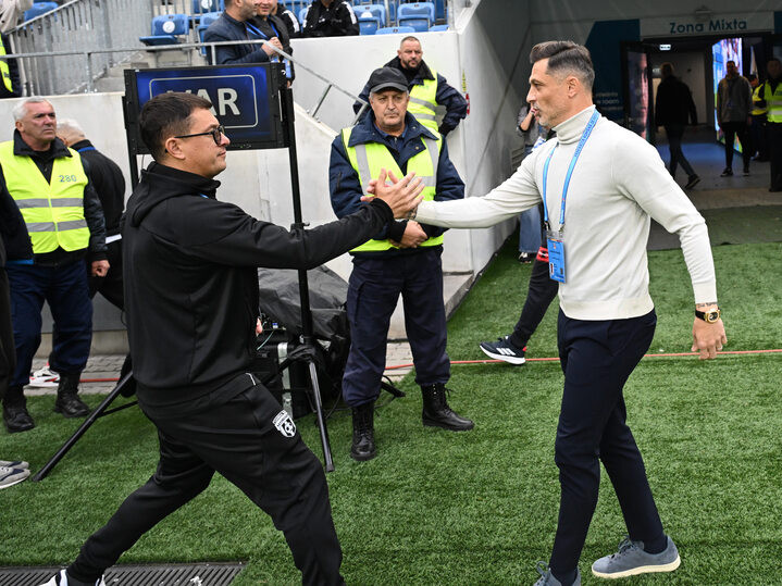 Descriere: Cei doi antrenori Andrei Prepelita și Matei Mirel Radoi se salută înaintea meciului dintre Universitatea Craiova si Unirea Slobozia, contand pentru Superliga Superbet, desfasurat pe Stadionul Ion Oblemenco din Craiova, sambata 18 octombrie 2025. © FOTO:Razvan Pasarica/SPORT PICTURES