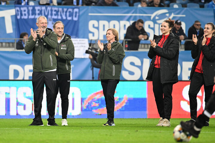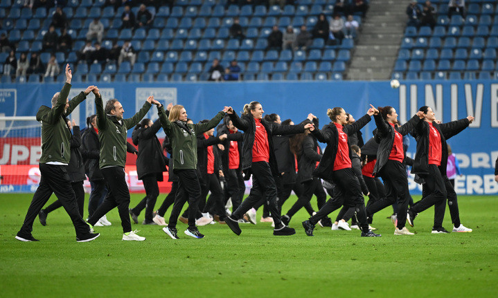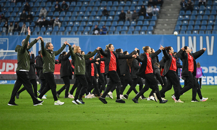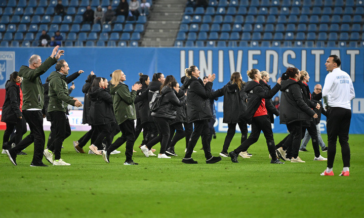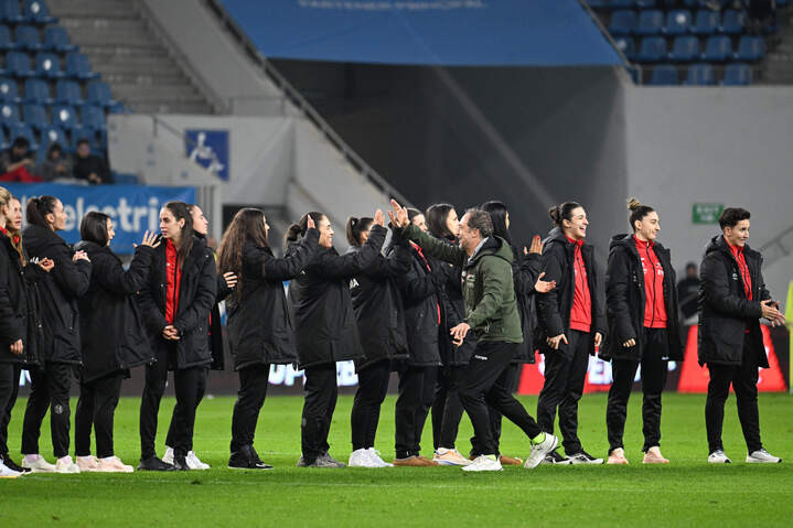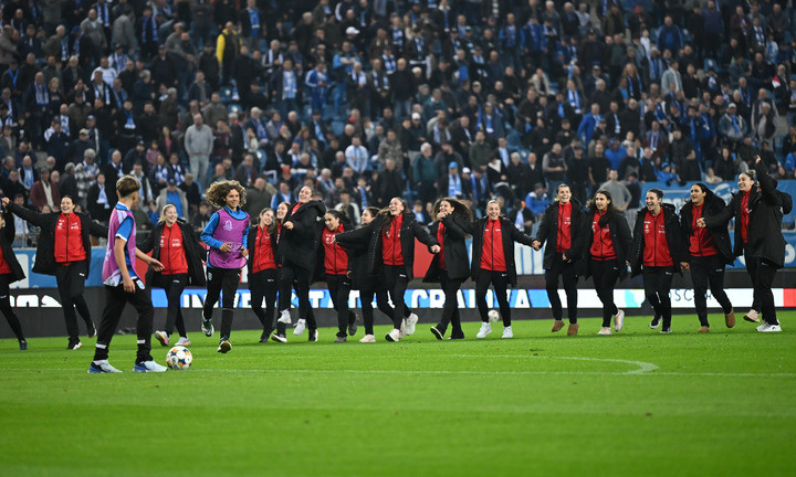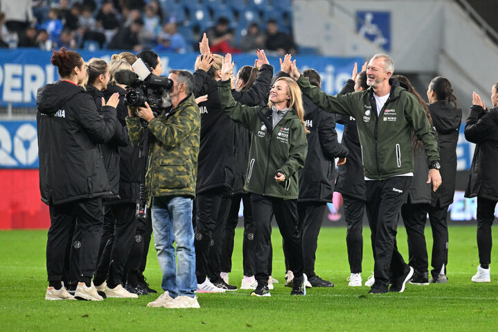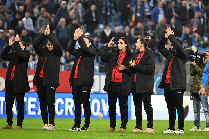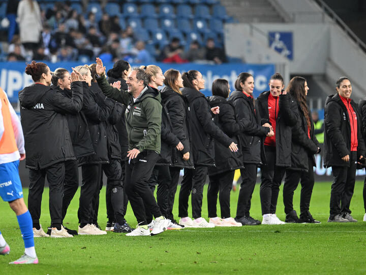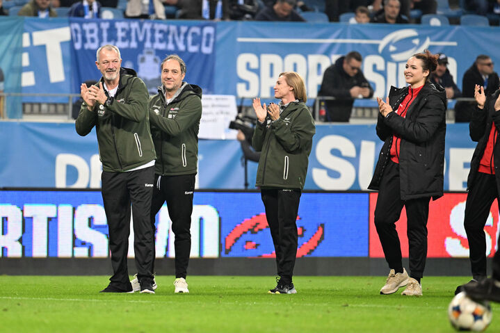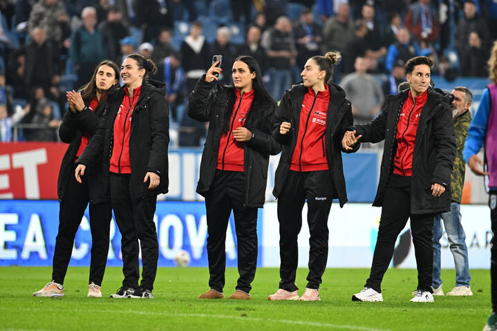 Descriere: Handbalistele Romaniei, aici alături de antrenorul lor Ovidiu Mihaila, prezentate publicului la pauza meciului dintre Universitatea Craiova si Unirea Slobozia, contand pentru Superliga Superbet, desfasurat pe Stadionul Ion Oblemenco din Craiova, sambata 18 octombrie 2025. © FOTO:Razvan Pasarica/SPORT PICTURES