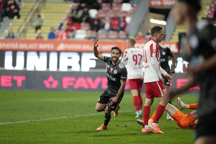 Descriere: Andre Miguel Pinto Lopes se bucura dupa un gol marcat in meciul de fotbal dintre UTA Arad si SC Otelul Galati, contand pentru Superliga Superbet, desfasurat pe Arena Francisc Neuman din Arad, duminica 19 octombrie 2025. © FOTO:Alexandra Fechete/SPORT PICTURES