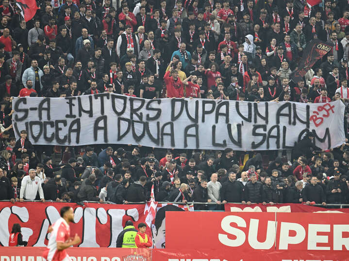 Descriere: Baner al galeriei dinamoviste la adresa liderului galeriei rapidiste, Bocciu, afisat in peluza la meciul de fotbal dintre Dinamo Bucuresti si Rapid Bucuresti, din cadrul Superligii Superbet, desfasurat pe Arena Nationala din Bucuresti, duminica 19 octombrie 2025. © FOTO:Razvan Pasarica/SPORT PICTURES